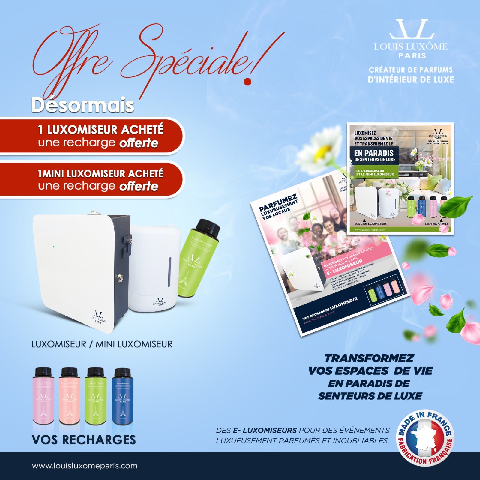 - Le E-LUXÔMISEUR propose 4 recharges luxômisantes à base d'huiles essentielles et huiles parfumées 100 % pures, naturelles, hyper-concentrées et ultra raffinées ne contenant ni eau, ni alcool, ni gaz afin parfumer agréablement et luxueusement vos espaces publics et privés. Les Ingrédients proviennent de la capitale mondiale du Parfum en France où sont conçus les plus grands parfums au Monde. Les senteurs de nos parfums d'intérieur de luxe s'appuient sur les bienfaits de l'aromathérapie et de l'aromachologie afin de procurer à vous et vos convives Relaxation, Bien-être et Confort....